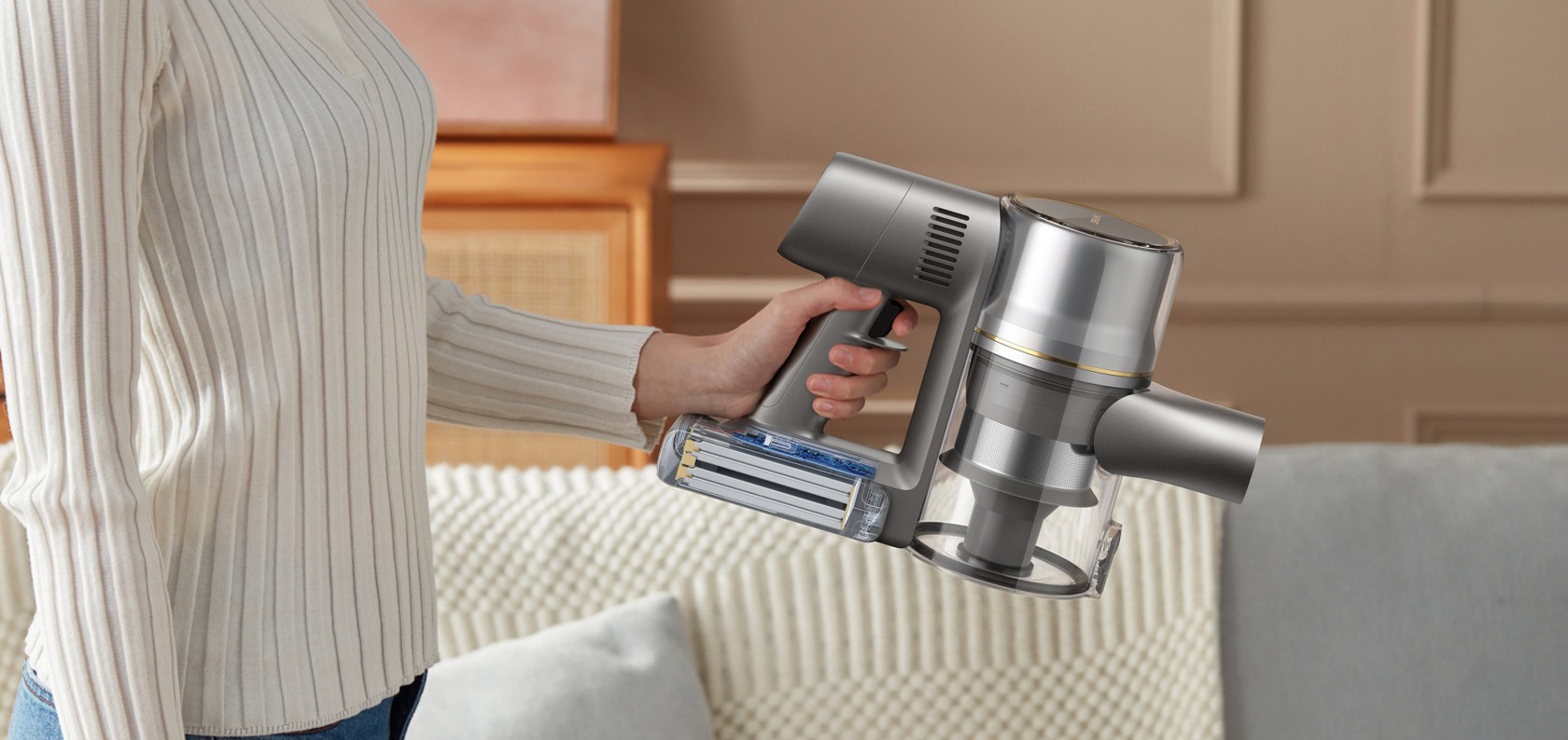 Dreame R20 Essential представляет собой вертикальный пылесос в элегантной цветовой гамме. Лаконичный современный дизайн органично впишется в интерьер любого дома. При достаточно больших габаритах и весе всего 1,76 кг устройство выглядит компактно и остаётся манёвренным в процессе уборки.