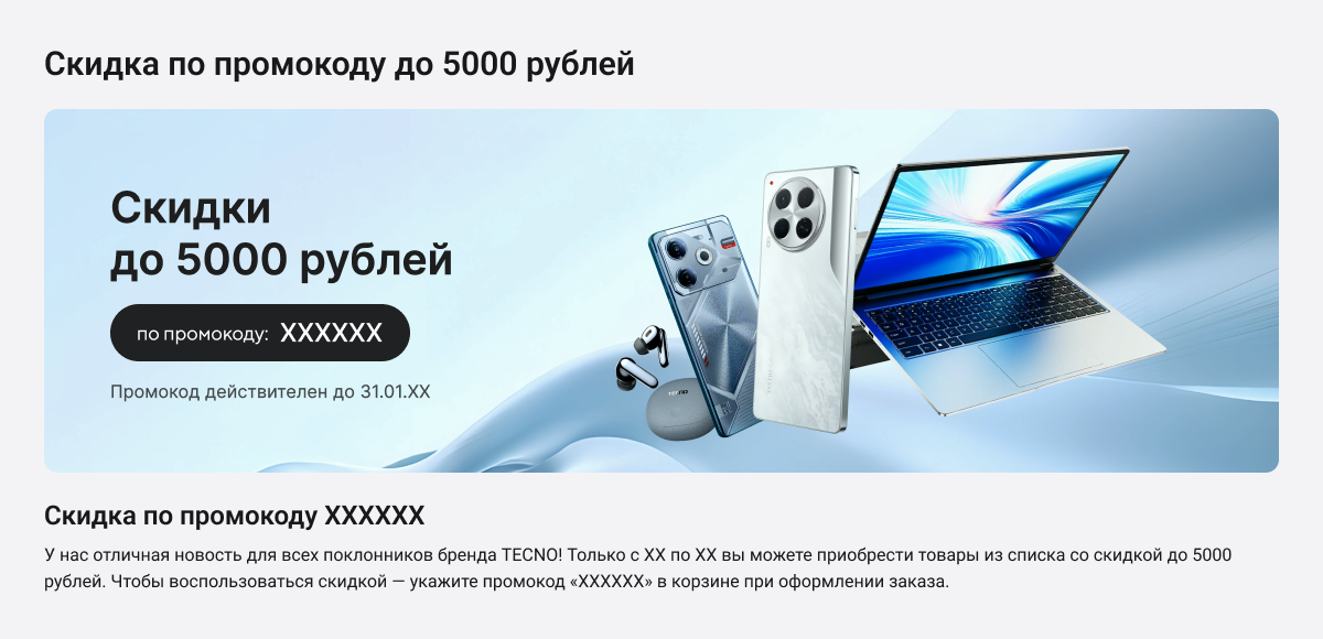 Промокод — это уникальная комбинация из букв и/или цифр, которая позволяет получить дополнительную скидку на определенный товар, услугу или весь заказ. Чтобы применить промокод, введите его при оформлении заказа на сайте в специальном поле.